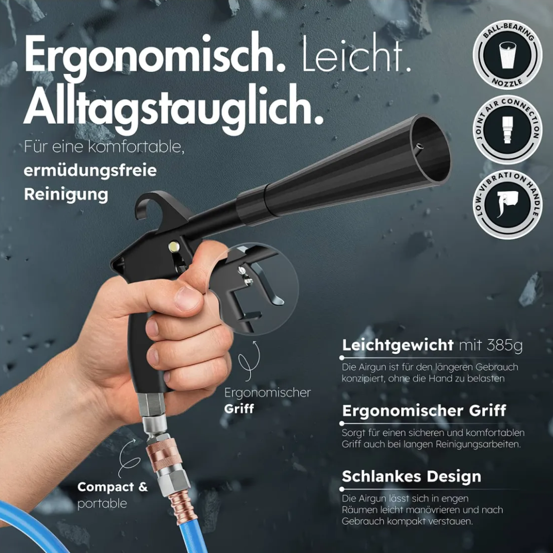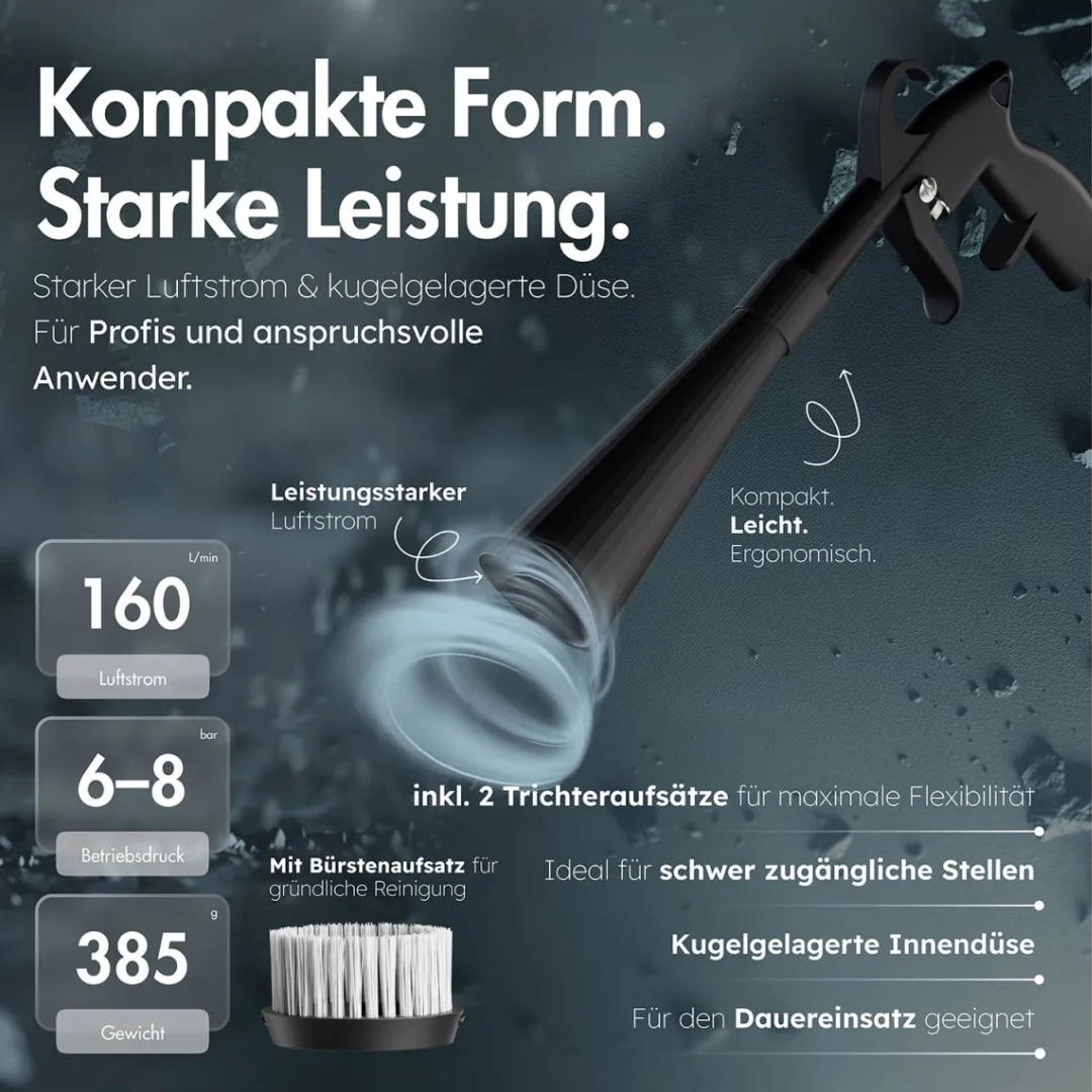 chemicalworkz AirGun är den ultimata lösningen för snabb och grundlig torrengöring av svåråtkomliga ställen. Oavsett om det gäller ventilationsutblås, sätesskenor, dörrfack eller motordelar, tar AirGun enkelt bort även den mest envisa smuts. Tack vare det höga luftflödet och den kullagrade munstyckstekniken erbjuder denna rengöringspistol imponerande prestanda och en lång livslängd.