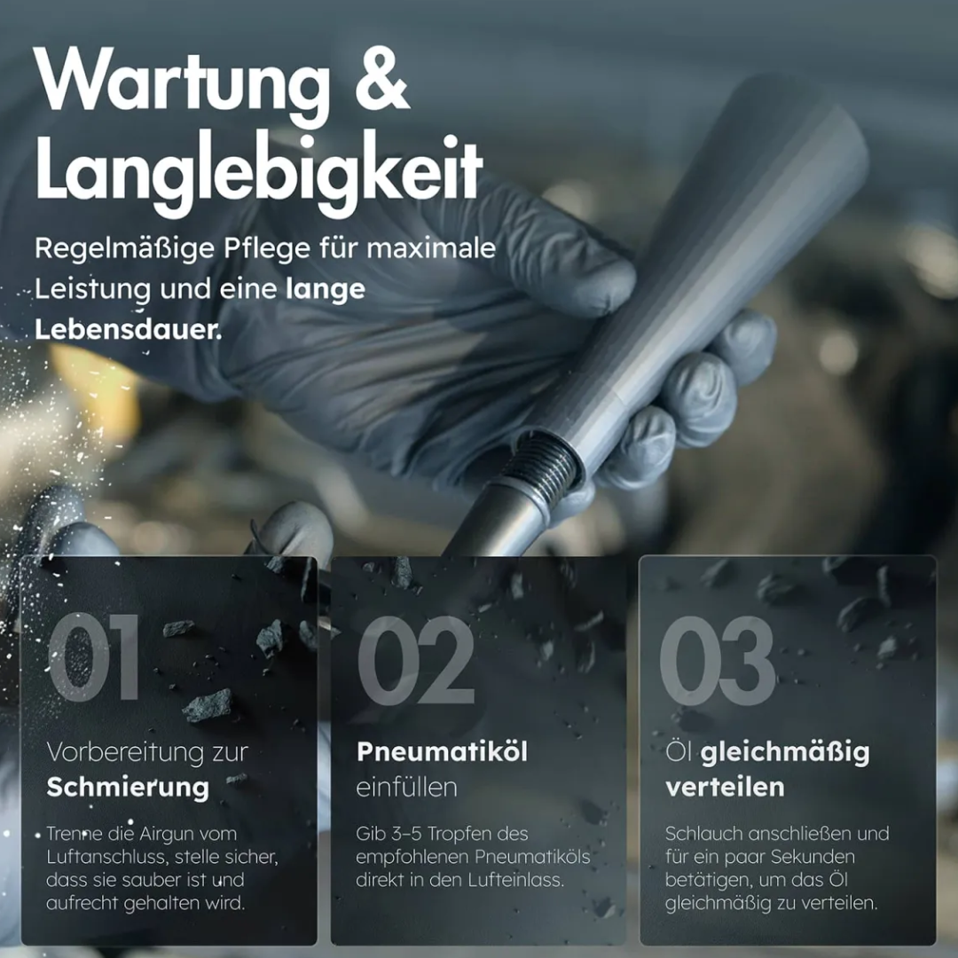 Viktig information: För att säkerställa optimal livslängd och funktion rekommenderar vi att verktyget smörjs med en droppe tryckluftsolja efter varje arbetsdag. Detta håller de interna komponenterna smidiga och skyddar mot slitage.