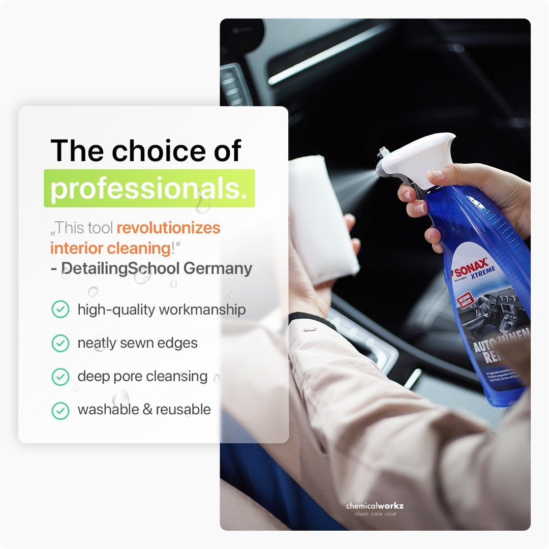 Chemicalworkz Interior Cleaning Pad Ergo sätter nya standarder inom invändig städning – och nu finns de praktiska rengöringsdynorna i en värdesats om 3! Perfekt för dig som vill ha mer flexibilitet och bekvämlighet vid rengöring. Den ergonomiska versionen av den populära rengöringsdynan är speciellt utvecklad för ännu mer bekväm och effektiv hantering. Med rundade hörn och en central söm ligger dynan perfekt i handen och gör att du kan rengöra exakt även svåråtkomliga områden och speciellt kurvor.