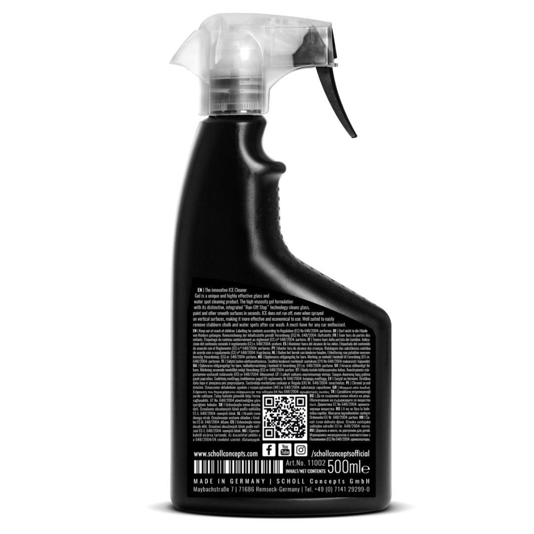 Den innovativa ICE Cleaner Gel är en unik och mycket effektiv rengöringsprodukt för glas. Gelformuleringen med hög viskositet med sin distinkta, integrerade ”Run-Off Stop” -teknologi rengör glas, lack och andra släta ytor på några sekunder, även ”waterspots”/ vatten fläckar tas enkelt bort